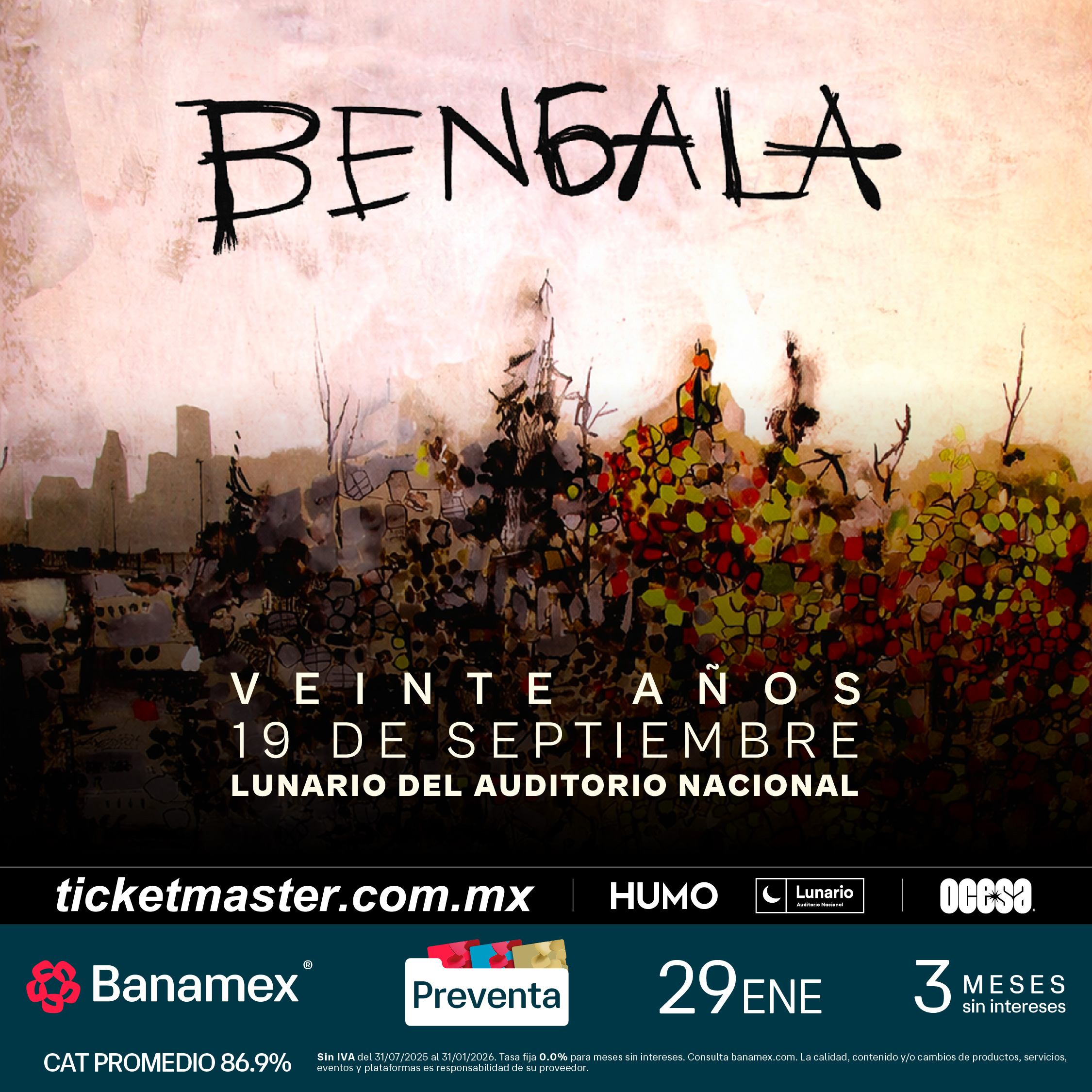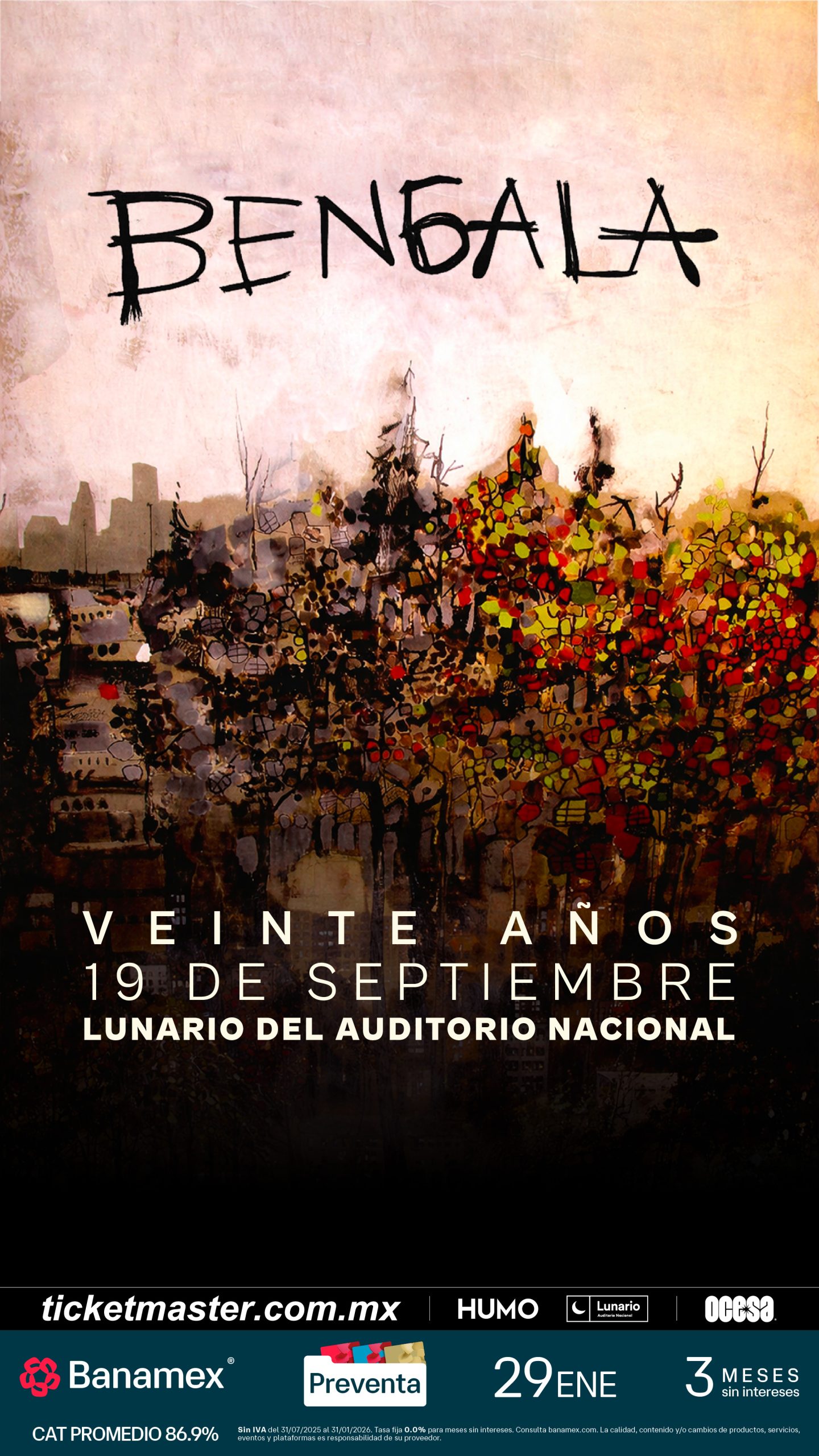 ¡No pierdas la oportunidad de celebrar 20 años de historia con una de las bandas más emblemáticas del rock alternativo mexicano, Bengala! Adquiere tus boletos en la preventa Banamex el 29 de enero y, un día después (30 de enero), los podrás adquirir en las taquillas del inmueble o a través de ticketmaster.com.mx.
