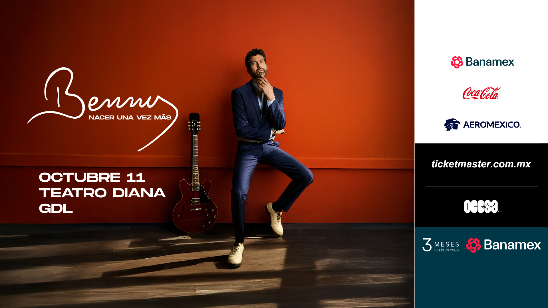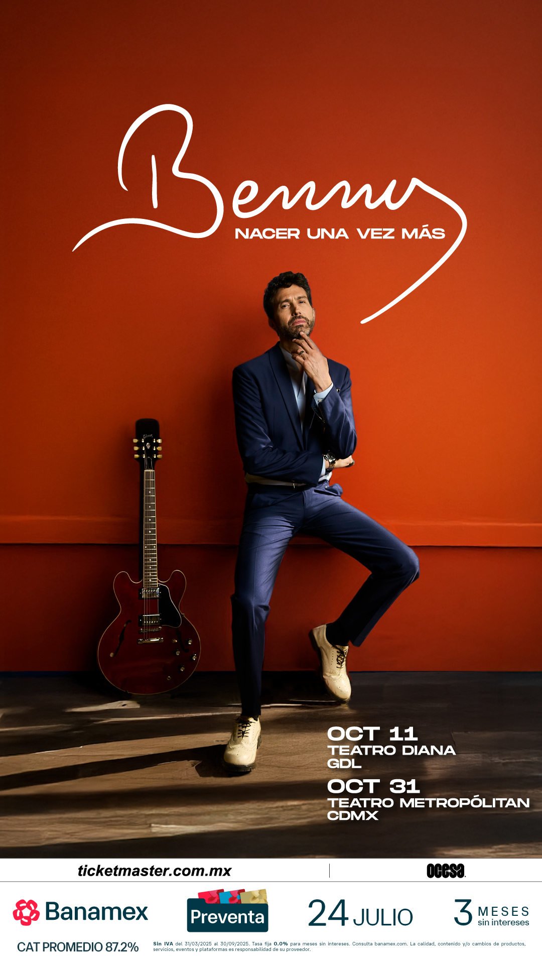 Escucha en vivo hits como “Mía”, “Sin ti” y su nuevo sencillo, “Nacer Una Vez Más”, el cual marca el inicio del nuevo capítulo en la vida musical de Benny Ibarra. Adquiere tus boletos en Preventa Banamex a partir del 24 de julio, mientras que la Venta General será un día después en las taquillas del inmueble y/o a través de Ticketmaster.