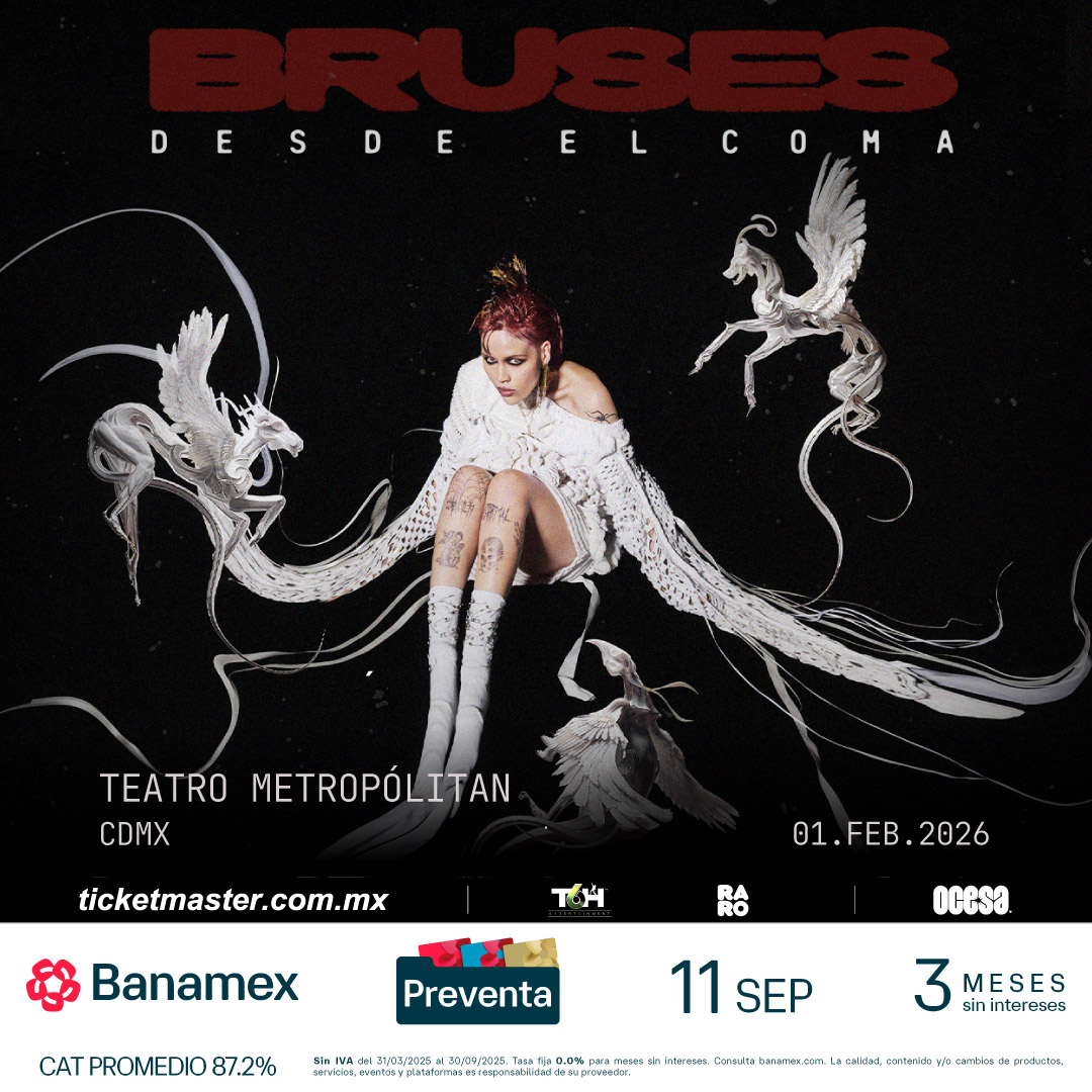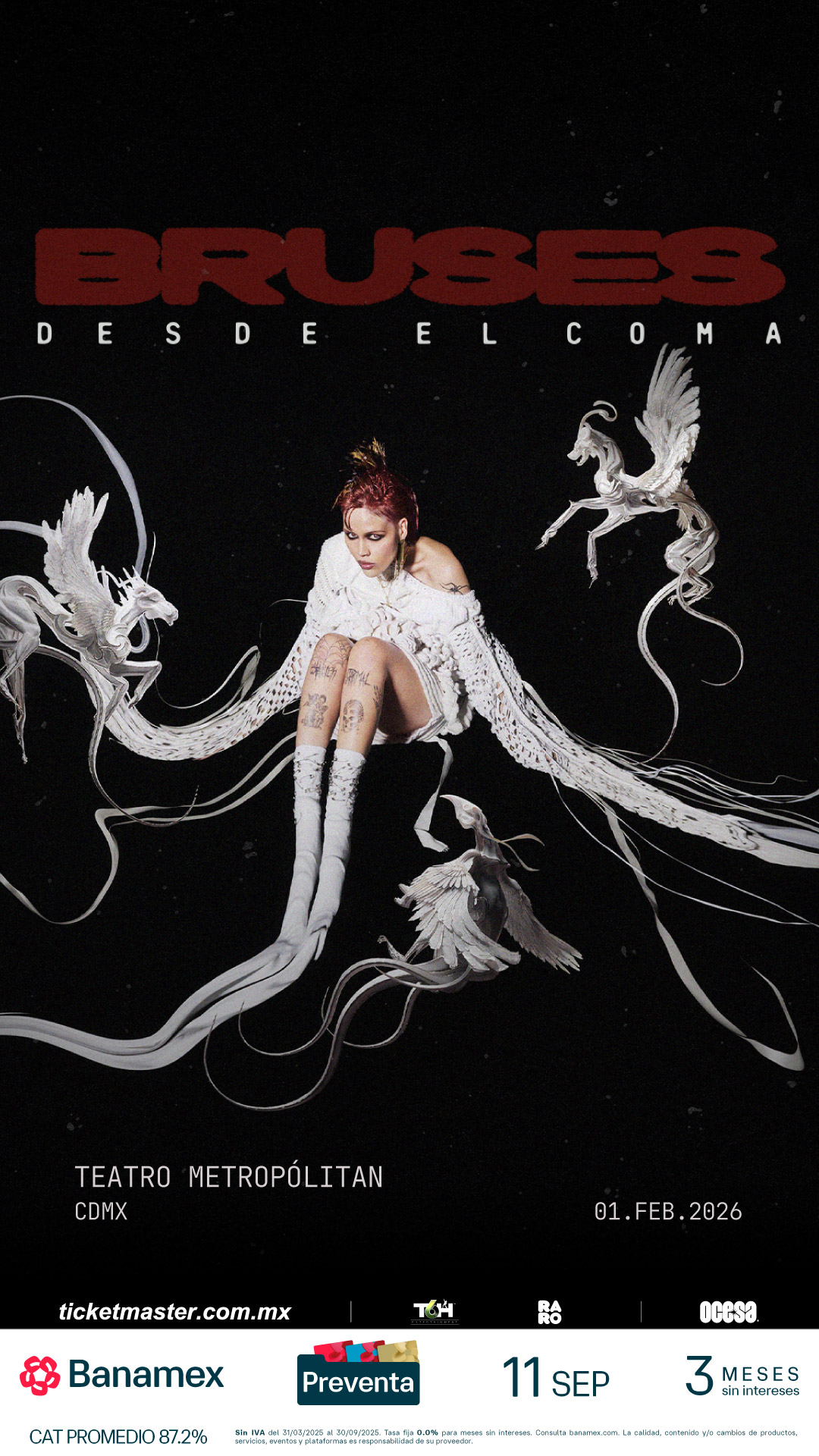 Bruses, la cantautora tijuanense que revolucionó la escena del alt-pop mexicano, llega al Teatro Metropólitan el próximo domingo 1 de febrero de 2026, para presentar su más reciente disco, Desde El Coma, además de sus más grandes éxitos.