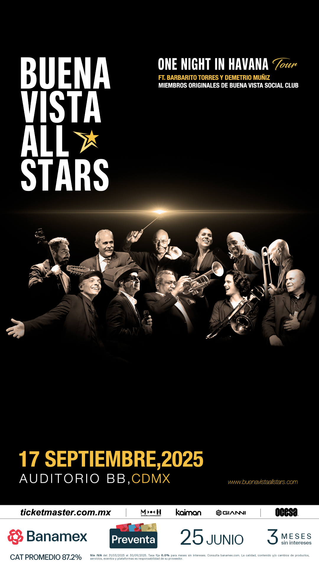 Buena Vista All Stars regresan el próximo miércoles 17 de septiembre a la CDMX, específicamente al Auditorio BB, el cual se llenará del sabor, la elegancia y la historia de su música cubana. Prepárate para una noche mágica al ritmo del son, el bolero y otros grandes géneros, con los herederos directos del legendario Buena Vista Social Club. Importantes músicos en escena, que te harán viajar directo a La Habana.