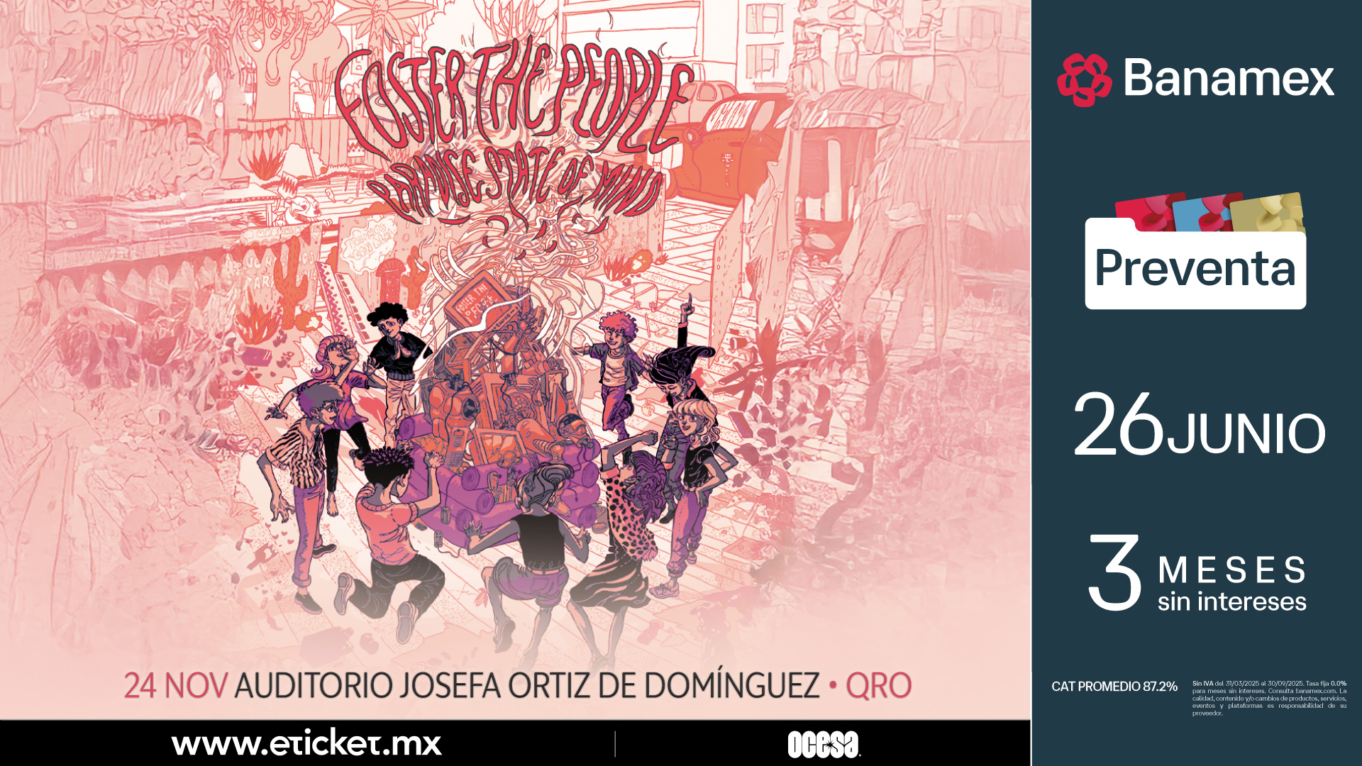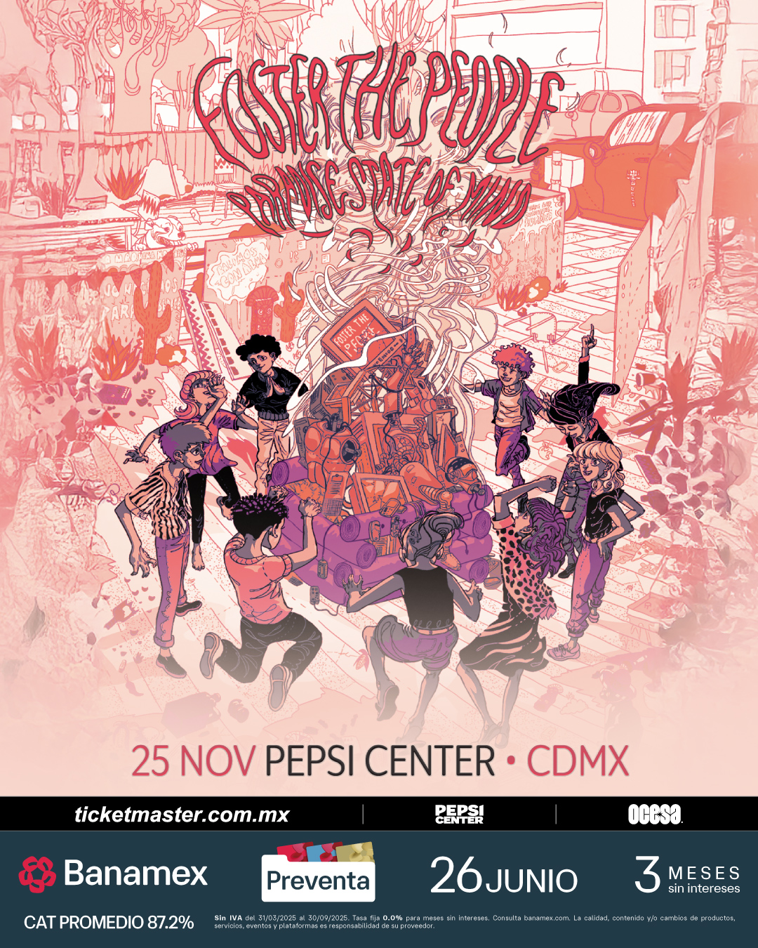 Foster The People -quienes recientemente concluyeron la exitosa etapa norteamericana de su Paradise State of Mind Tour- también tienen programada una gira europea este verano y una aparición en el festival Lollapalooza de Chicago, IL (1 de agosto). La preventa Banamex para las fechas de Foster The People en nuestro país será el 26 de junio a partir de las 11:00 horas y un día después los podrás adquirir en Ticketmaster para CDMX y Monterrey; para Querétaro será a través de Eticket.