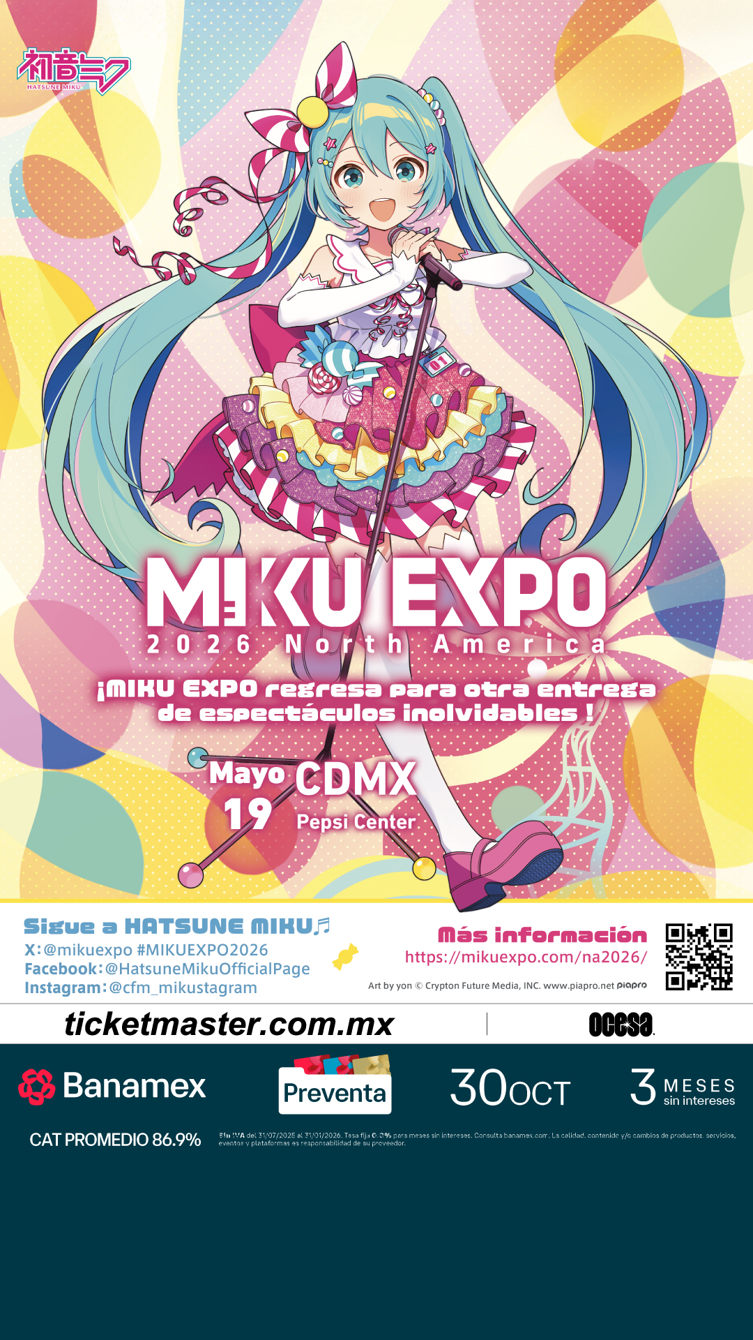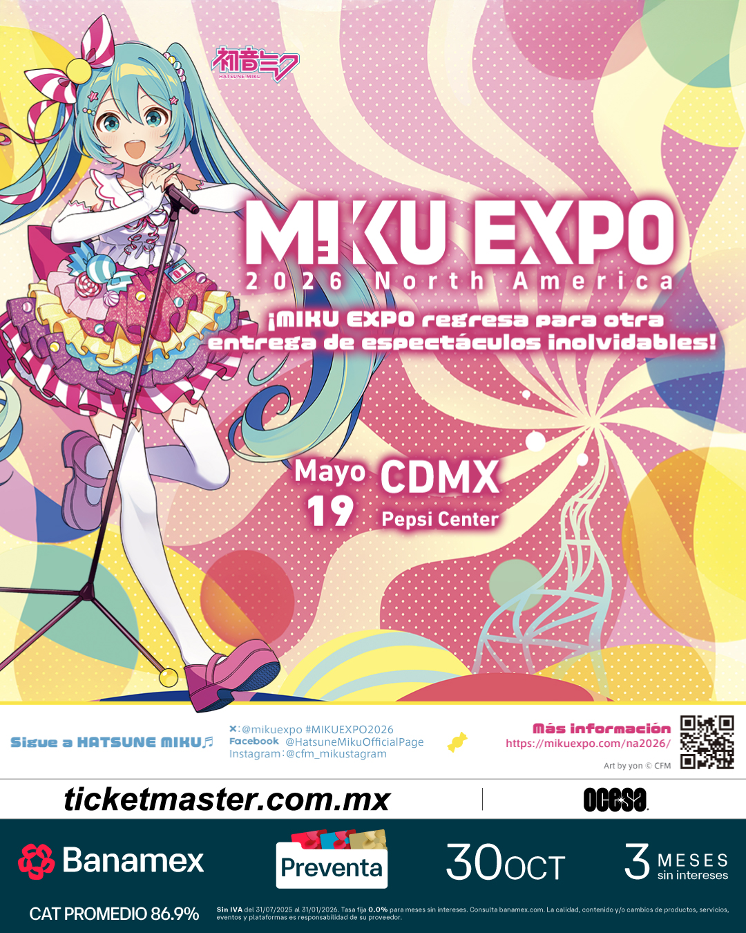 Prepárate para vivir una experiencia única donde la música, la tecnología y la cultura japonesa se fusionan en un solo espectáculo. La incomparable Hatsune Miku, la estrella virtual más famosa del planeta, llega al Pepsi Center para ofrecer un concierto inolvidable el próximo martes 19 de mayo de 2026. Con proyecciones en 3D, un show visual de última generación y la energía de miles de fans cantando al unísono, esta presentación promete ser el encuentro donde el futuro y la emoción conectan.