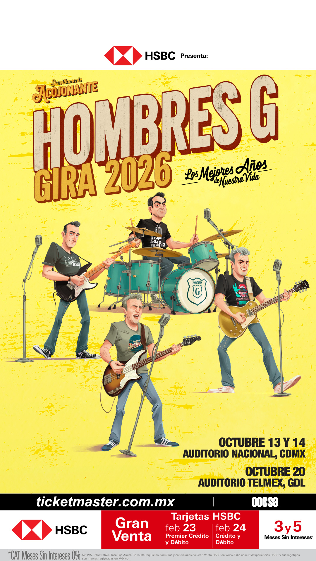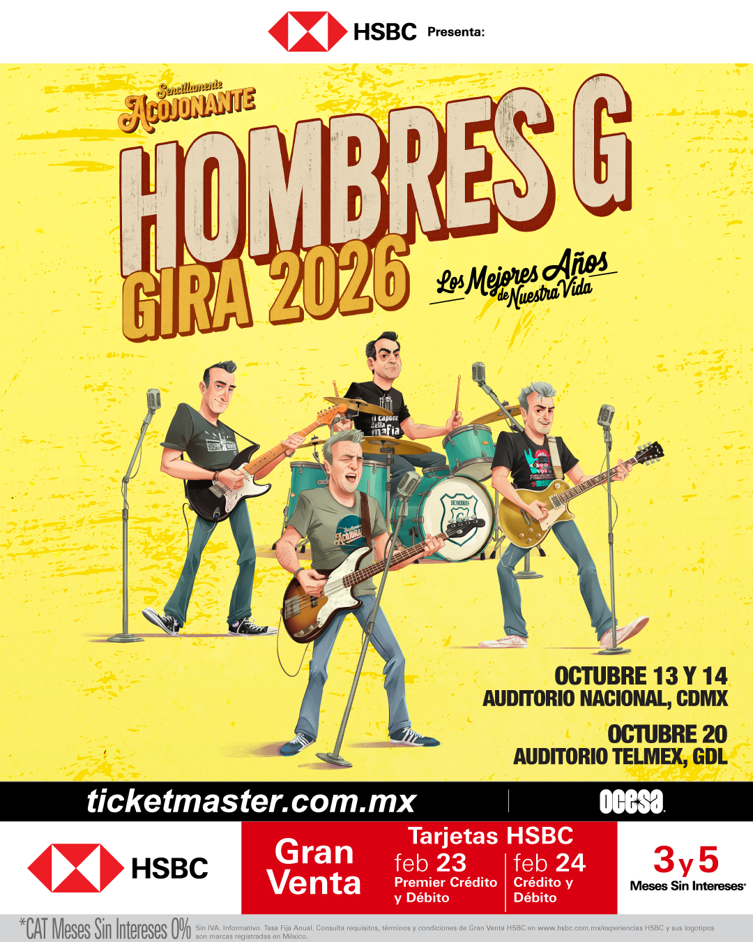 Una de las bandas más influyentes de rock en español está de vuelta en nuestro país. ¡Vive la experiencia de ver a Hombres G en concierto y se parte de Los Mejores Años De Nuestra Vida! Disfruta de la Gran Venta HSBC el 23 y 24 de febrero y de la Venta General desde el 25 de febrero.