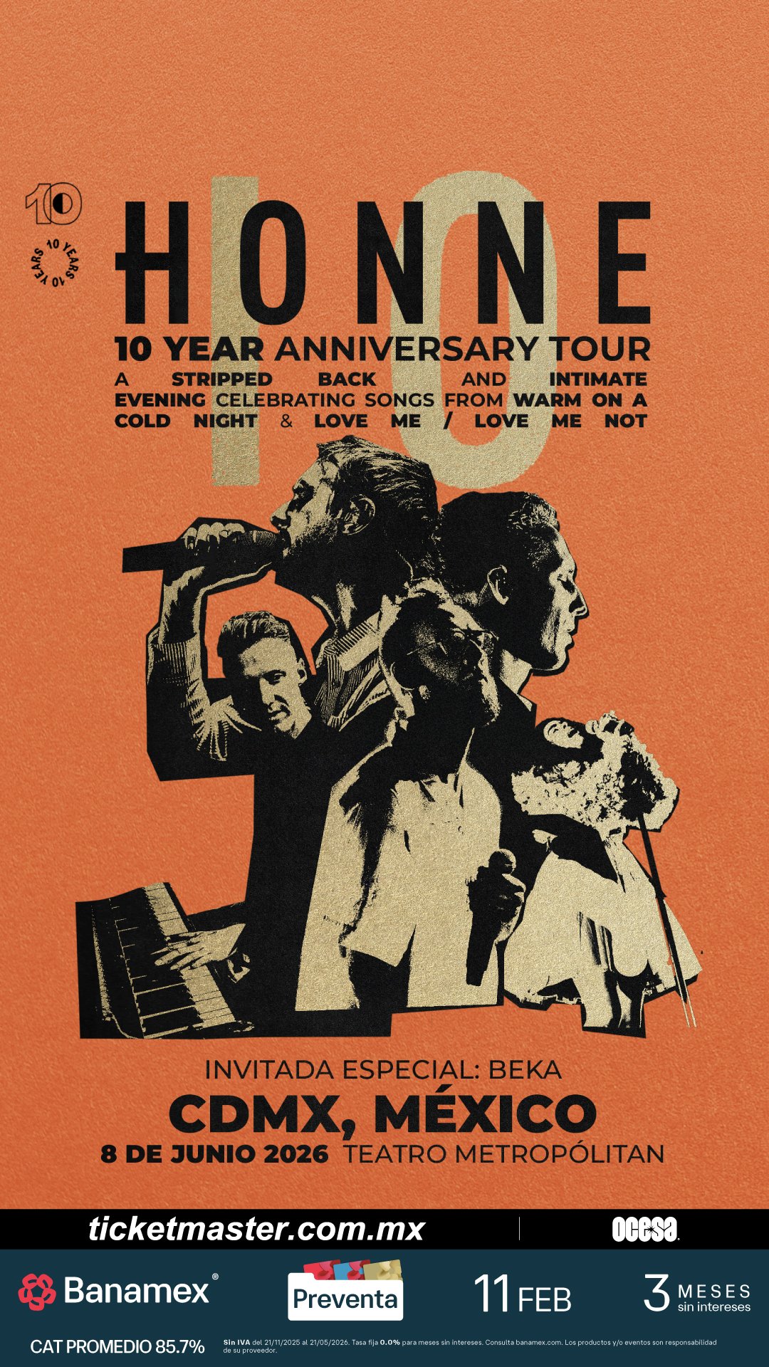 HONNE es conocido por su composición emocional y su distintiva mezcla de calidez, intimidad y producción moderna. A lo largo de la última década, HONNE ha acumulado más de 3 mil millones de reproducciones, obtenido múltiples certificaciones de platino en Asia —incluyendo 10 veces platino en Corea del Sur por su álbum debut Warm On A Cold Night—, vendido más de 210 mil boletos para sus presentaciones en vivo y actuado en algunos de los festivales más importantes del mundo, incluyendo Glastonbury, Summer Sonic, Lollapalooza, Austin City Limits, Corona Capital, Seoul Jazz Festival y Splendour in the Grass.