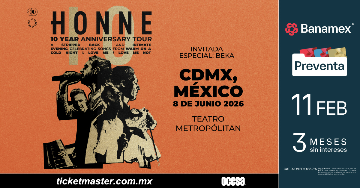 HONNEAhora, HONNE trae la magia de su música a nuestro país para volver a hacer vibrar el público mexicano en el marco de celebración de su 10º aniversario. Sumérgete en la experiencia única de escucharlos en vivo y cantar canciones de sus primeros álbumes, disfruta de este show en el Teatro Metropólitan el próximo lunes 8 de junio.