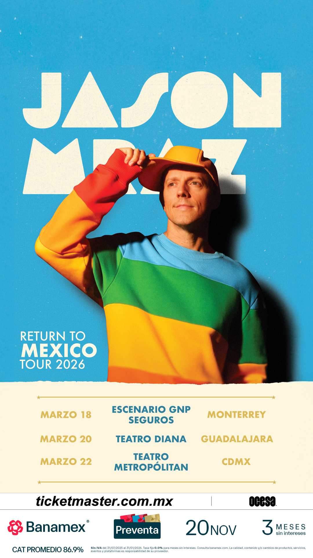 Jason MrazEl cantautor ganador del Premio GRAMMY, Jason Mraz, regresa a territorio mexicano por primera vez en casi 15 años con shows en Monterrey, Guadalajara y Ciudad de México.