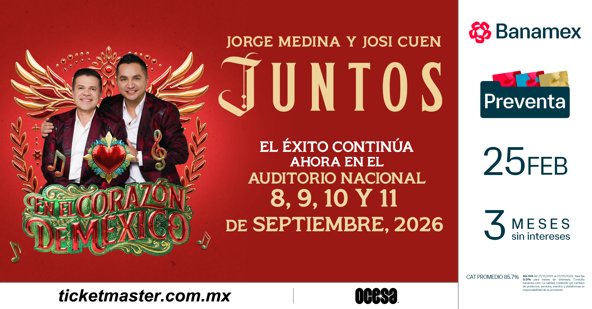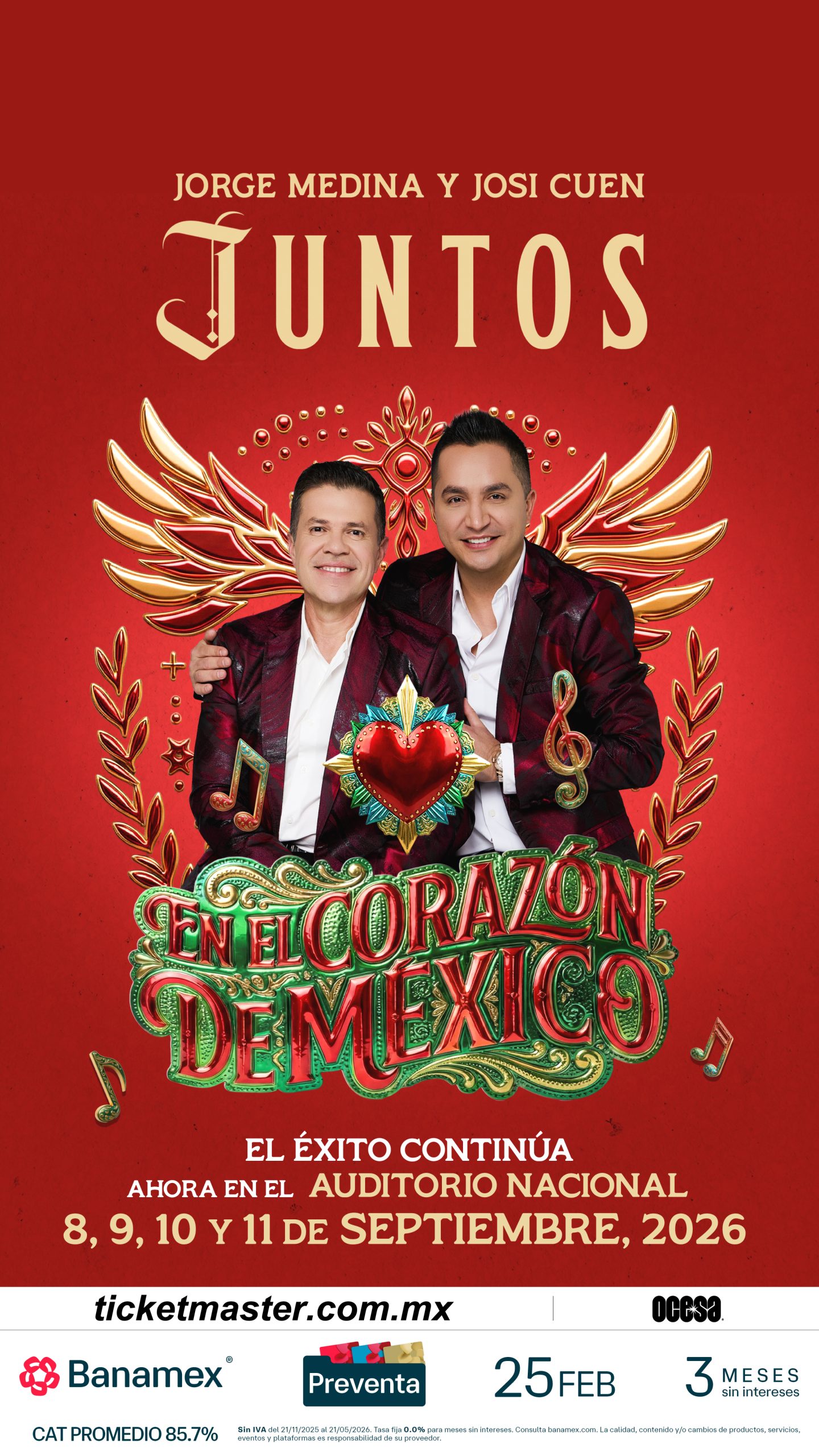 Este evento se perfila como el acontecimiento definitivo de 2026. Después de hacer historia con llenos en recintos monumentales como Plaza de Toros La México y el Estadio GNP, entre otros, este dúo dinámico (Jorge Medina y Josi Cuen) llega al Auditorio Nacional para ofrecer una presentación íntima pero poderosa, consolidando su estatus como leyendas vivas del género.