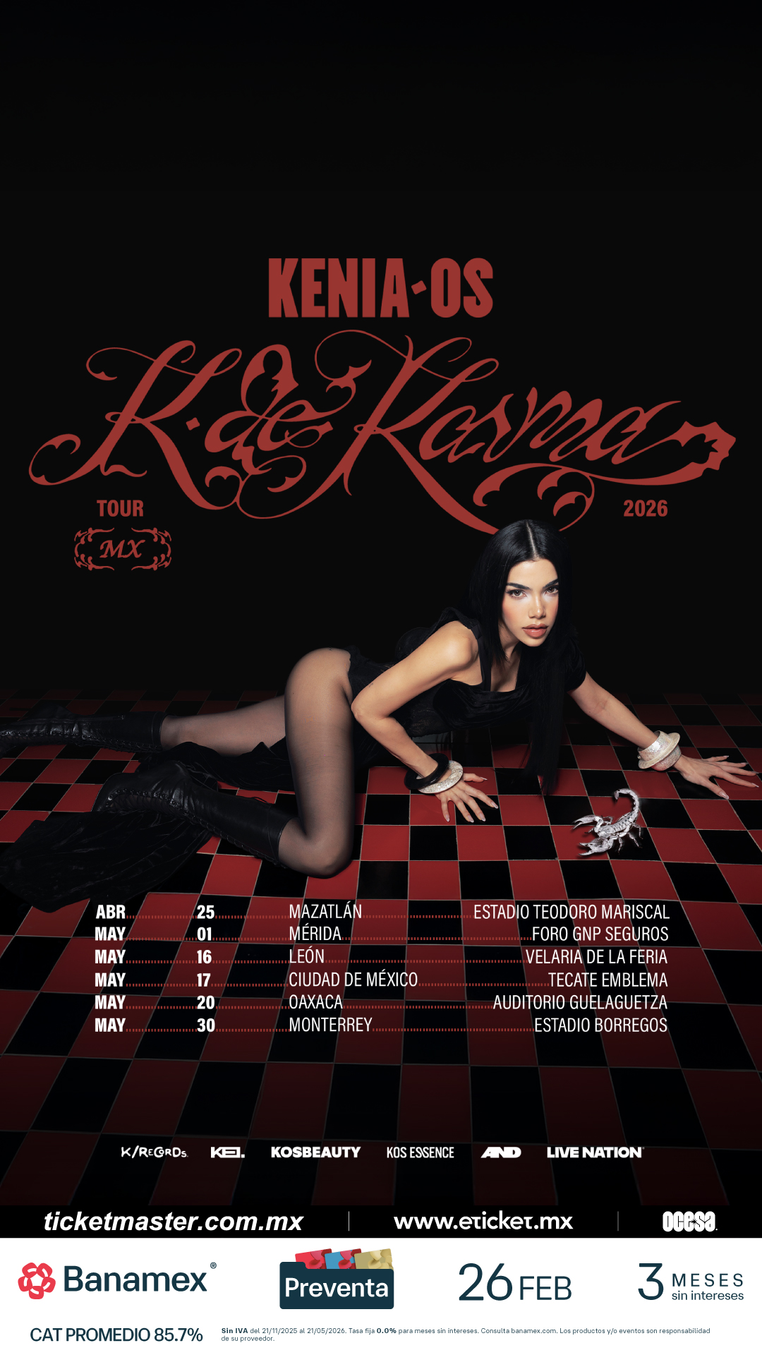 Kenia OS llevará lo más reciente de su música y lo mejor de sus éxitos a distintos puntos estratégicos del país para que sus seguidores más fieles vivan la experiencia de K DE KARMA. No te quedes fuera de este despliegue de energía: agenda la fecha en tu ciudad y prepárate para sumergirte por completo en esta vibrante nueva era que promete redefinir el pop actual.