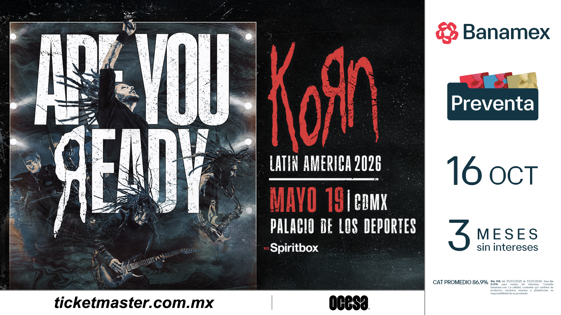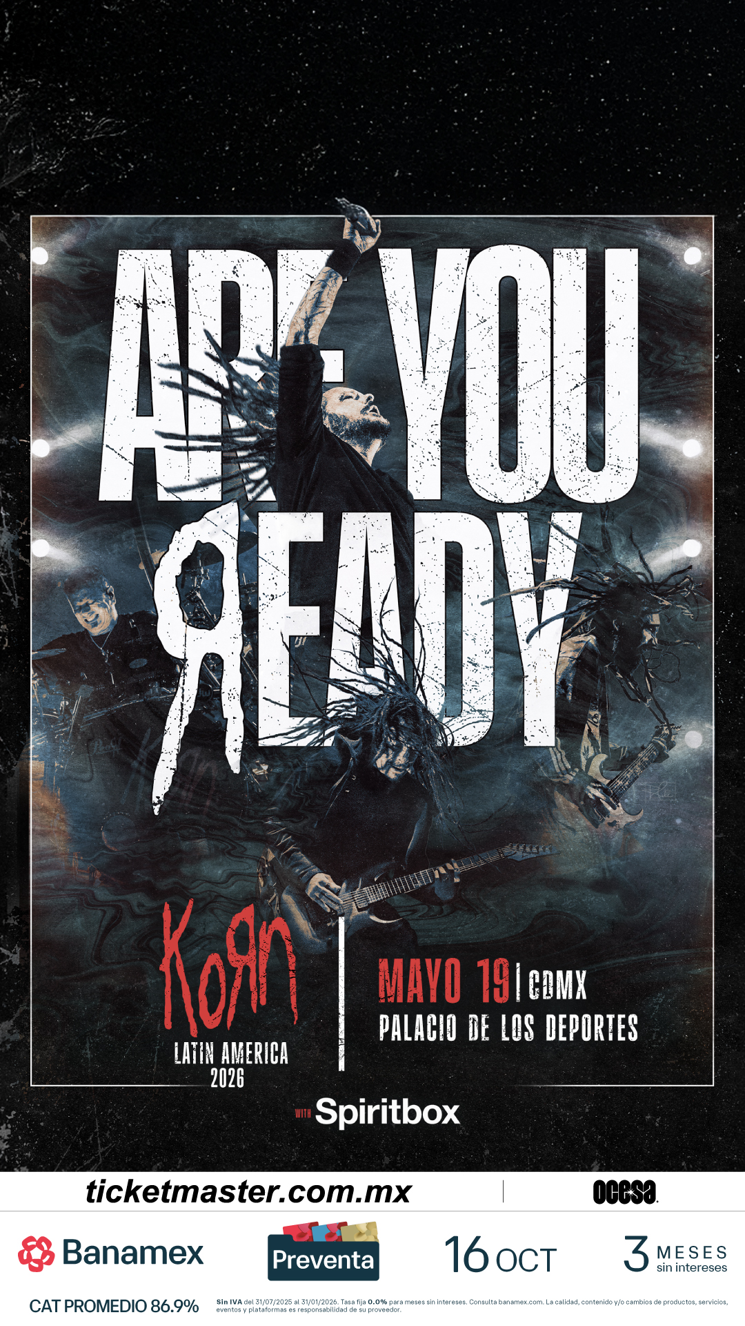 Al anunciar sus presentaciones en América Latina, KORN provocó a sus fans con una sola pregunta: “Are you ready?” La banda conoce el poder de lo que lleva al escenario, y el público está listo para presenciar la actuación de 1 de los íconos más grandes del rock mundial, abriendo camino para muchos y sin caer en la rutina. Eventos históricos como este son raros.