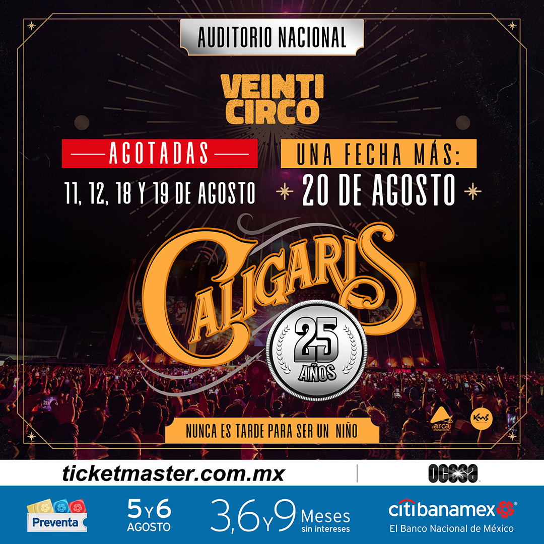 Si te quedaste sin boletos para Veinticirco en el Auditorio Nacional… ¡Esta es la señal que estabas esperando! Porque Los Caligaris quieren complacer a todos sus fans y confirman un 5º show para celebrar su primer cuarto de siglo el próximo sábado 20 de agosto. Esta podría ser tu última oportunidad.