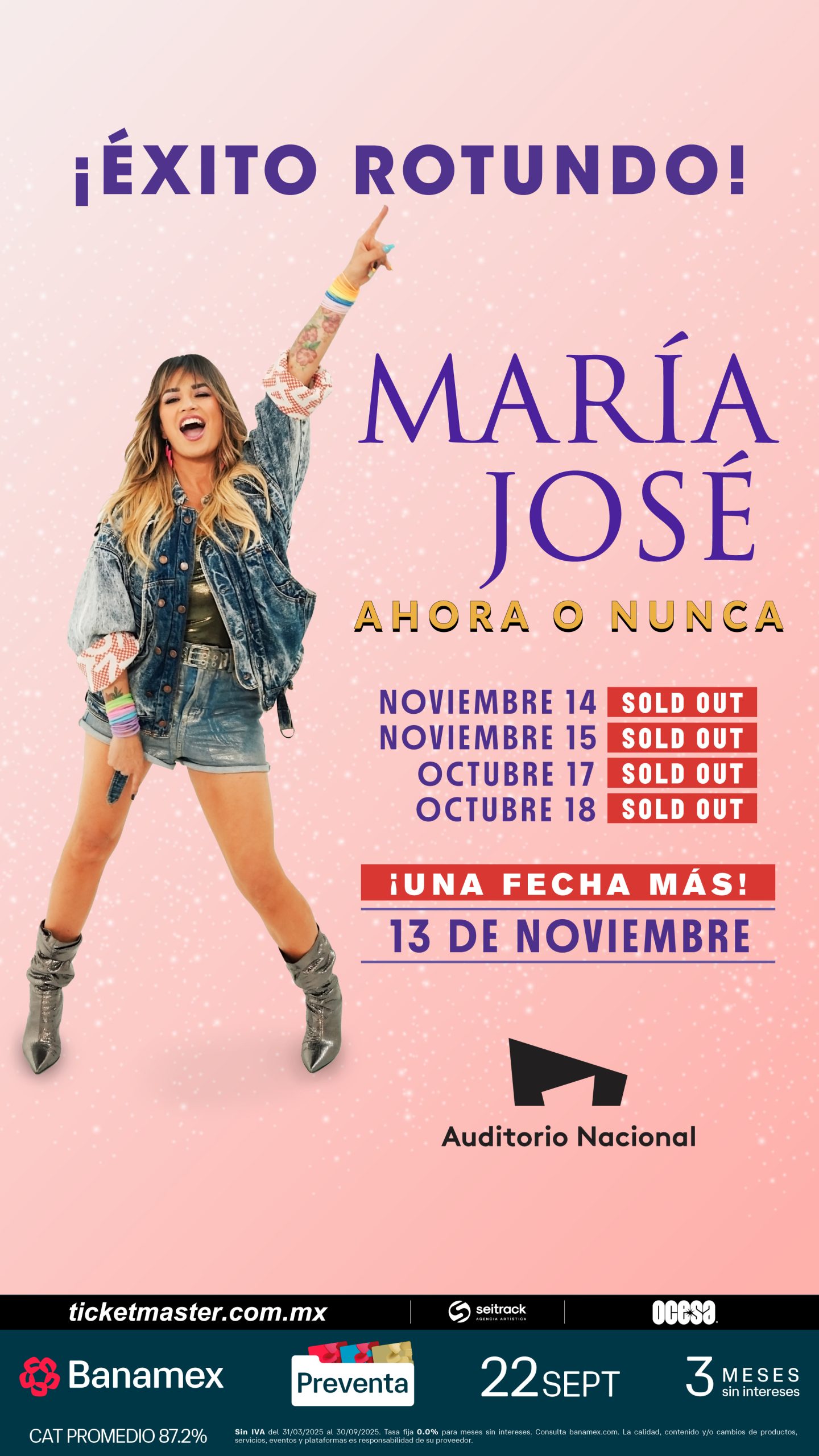 María José¡María José arrasa en la CDMX y anuncia nuevas fechas! Tras agotar sus 2 primeras presentaciones en el Auditorio Nacional en un par de días, ‘La Josa’ demuestra de nueva cuenta, porqué es una de las voces más poderosas del pop latino. A petición del público, se suman un par de shows de su impactante gira Ahora o Nunca, con la que celebra el lanzamiento de su nuevo EP y repasa los éxitos que han marcado su carrera.