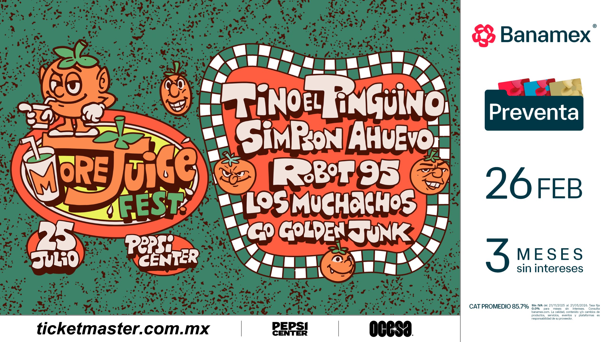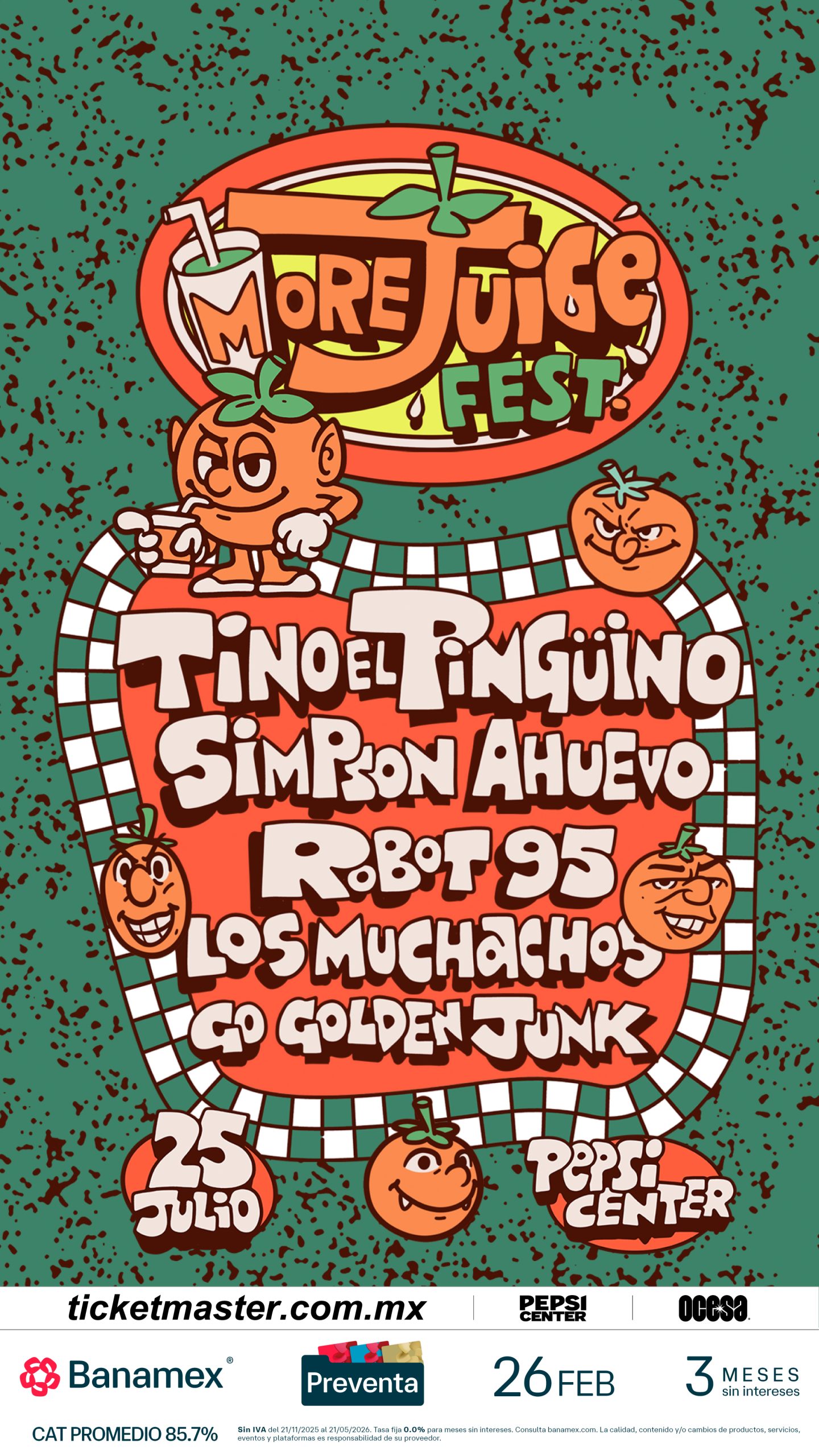 Se parte de MoreJuice Fest y conviértete en testigo del presente y futuro de la música. Asegura tus boletos durante la Preventa Banamex el 26 de febrero o bien, en la Venta General que se liberará un día después, el 27 de febrero a través de Ticketmaster y/o en la taquilla del inmueble.
