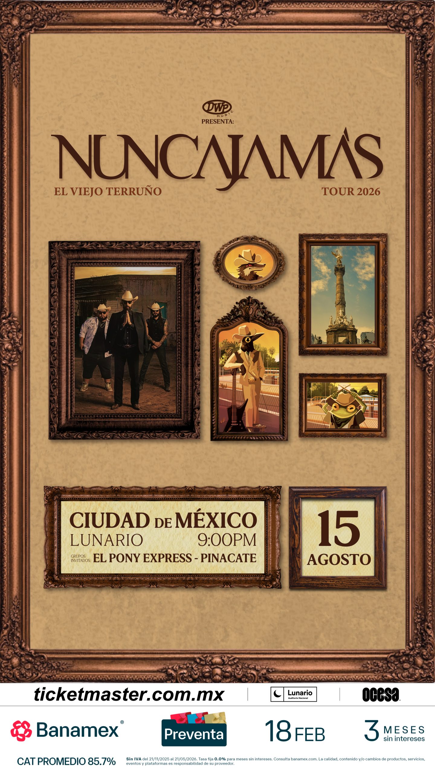 Nunca JamásNunca Jamás llegará al Lunario del Auditorio Nacional el próximo sábado 15 de agosto de 2026, para convertirlo en el escenario ideal del rock agropecuario, una fusión poderosa que combina la energía del rock con los ritmos norteños y la banda sinaloense. Su propuesta, auténtica y profundamente ligada a las raíces del noroeste mexicano, ha transformado cada una de sus presentaciones en una celebración eufórica donde el público vive la música con intensidad total.