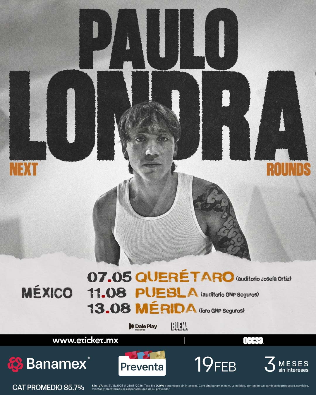 Con éxitos que han marcado una generación como “Nena Maldición”, “Adán y Eva”, “Por Eso Vine” y “Cuando Te Besé”, Paulo Londra promete noches llenas de emoción, energía y una puesta en escena al nivel de su esperado regreso en México; el 7 de mayo en Querétaro (Auditorio Josefa Ortiz De Dominguez), el 11 de agosto en Mérida (Foro GNP Seguros), y el 13 de ese mismo mes en Puebla (Auditorio GNP Seguros).