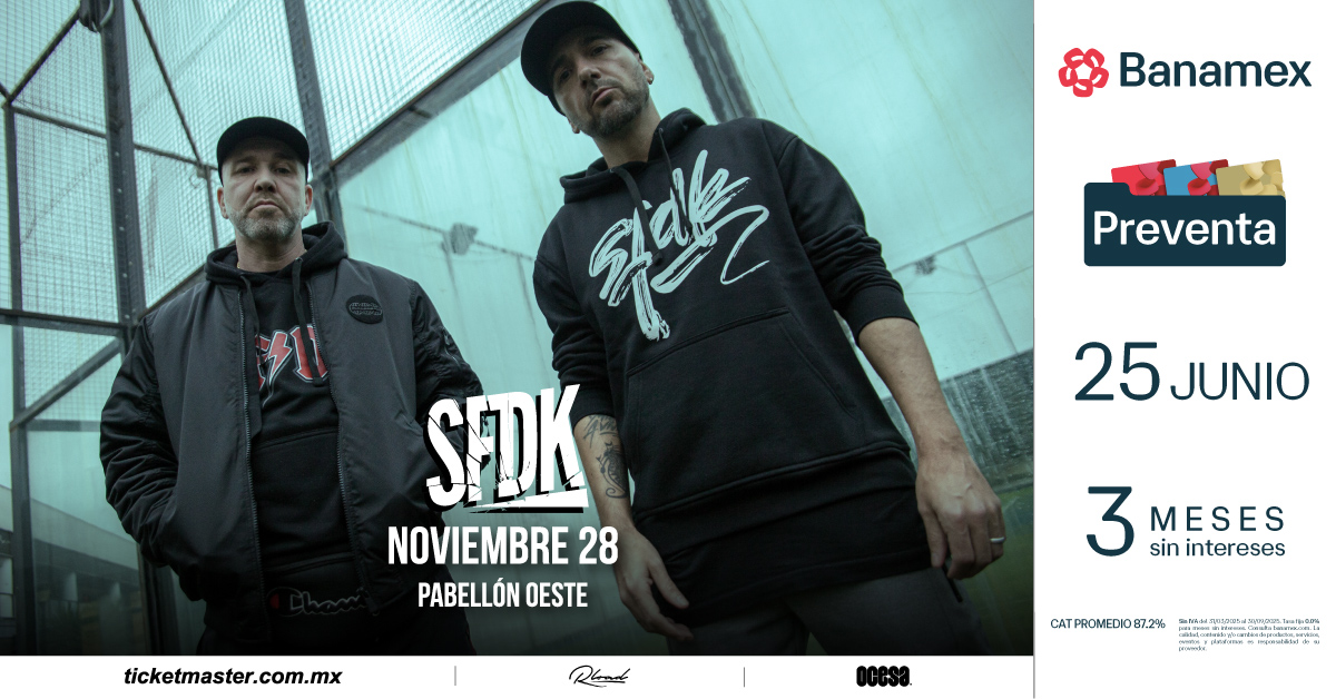 Esta es tu oportunidad de ver en vivo a SFDK, una de las bandas más influyentes y respetadas del género. Ponte listo para comprar por tus boletos para el 28 de noviembre en el Pabellón Oeste del Palacio de los Deportes y prepárate para una noche llena de rimas poderosas, beats increíbles y energía inconfundible.