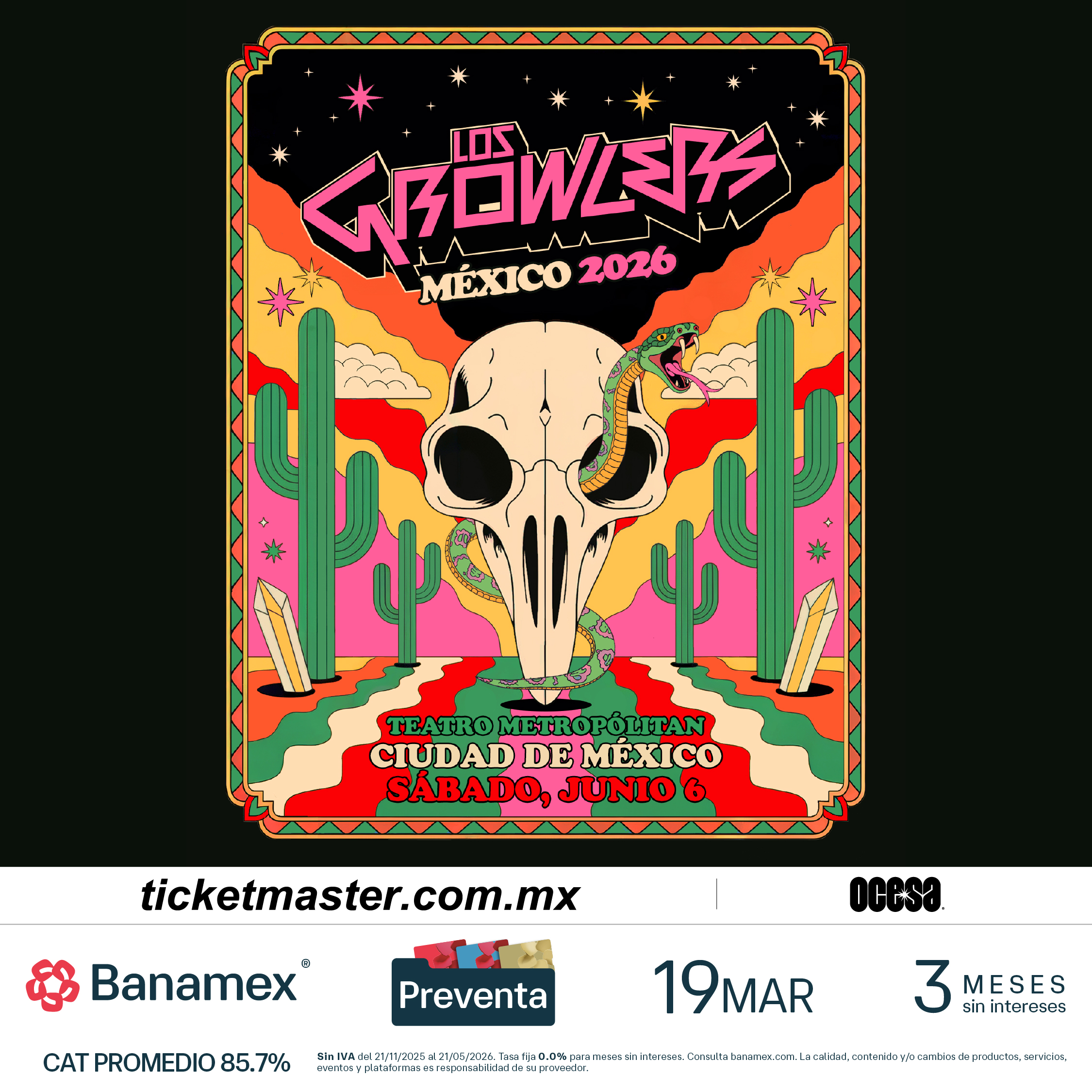 La Preventa Banamex comenzará el 19 de marzo, mientras que la Venta General se liberará un día después, el 20 de marzo a las 11:00 horas a través de Ticketmaster o en la taquilla del inmueble. Por su parte, la Preventa Artista tendrá lugar el 18 de marzo a través de TheGrowlers.com