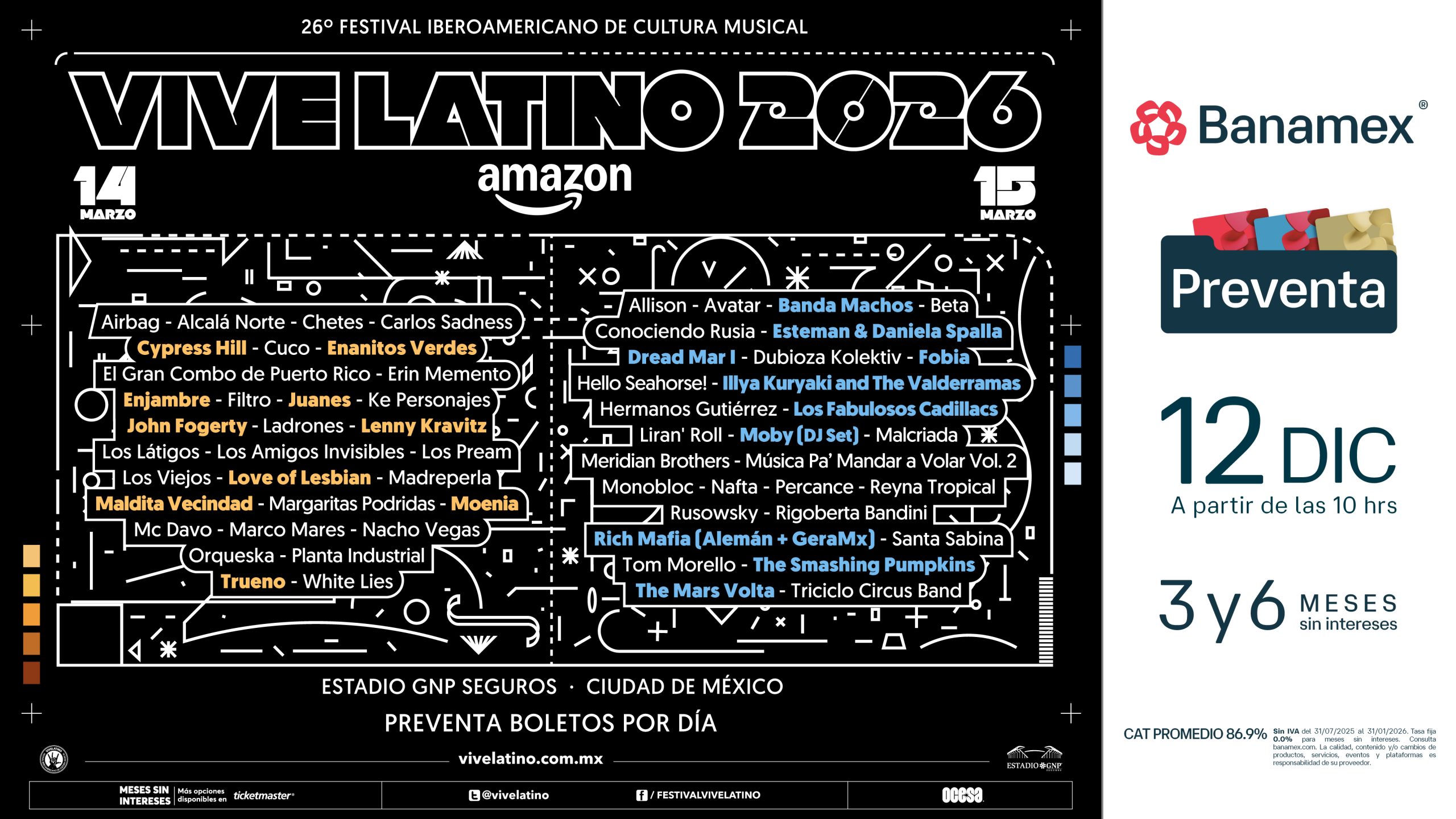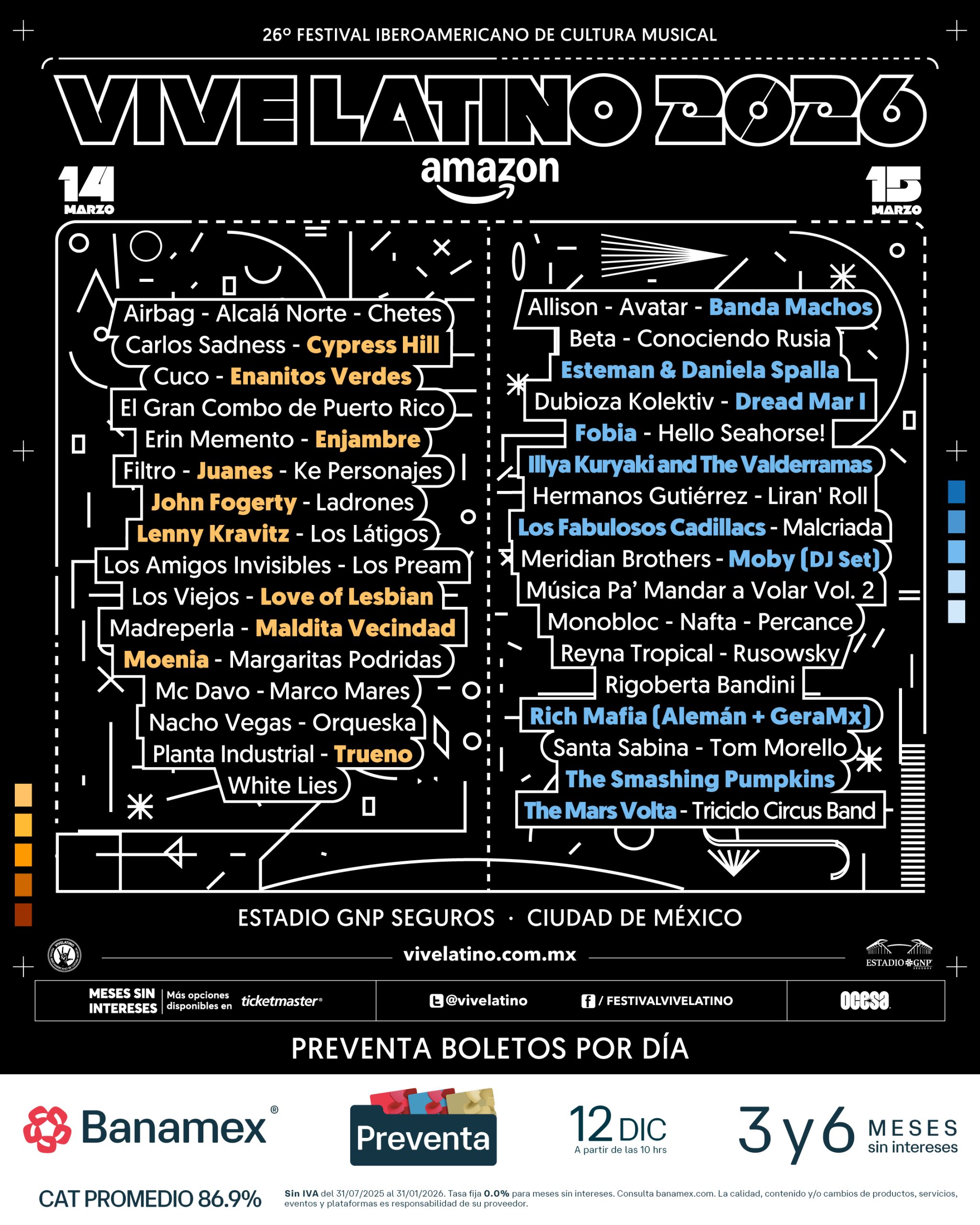 La gran celebración de la música en el Vive Latino se llevará a cabo los días 14 y 15 de marzo. Un recinto que ha sido testigo de nuestra euforia durante 25 años se vestirá de gala. Serán 2 jornadas inigualables donde las mejores bandas, aquellas que representan nuestra vida y nuestras emociones, subirán al escenario para darlo todo.